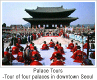 four major palaces built during the Joseon Dynasty. In Gyeongbokgung Palace built in 1395 by the first King of the dynasty, Gyeonghoeru, a spacious two-story pavilion, overlooking a picturesque man-made pond served as a feasting hall for gatherings of royal ministers and diplomats. The National Museum located on the palace grounds is filled with artifacts of the 5,000 years of Korean cultural heritage. |